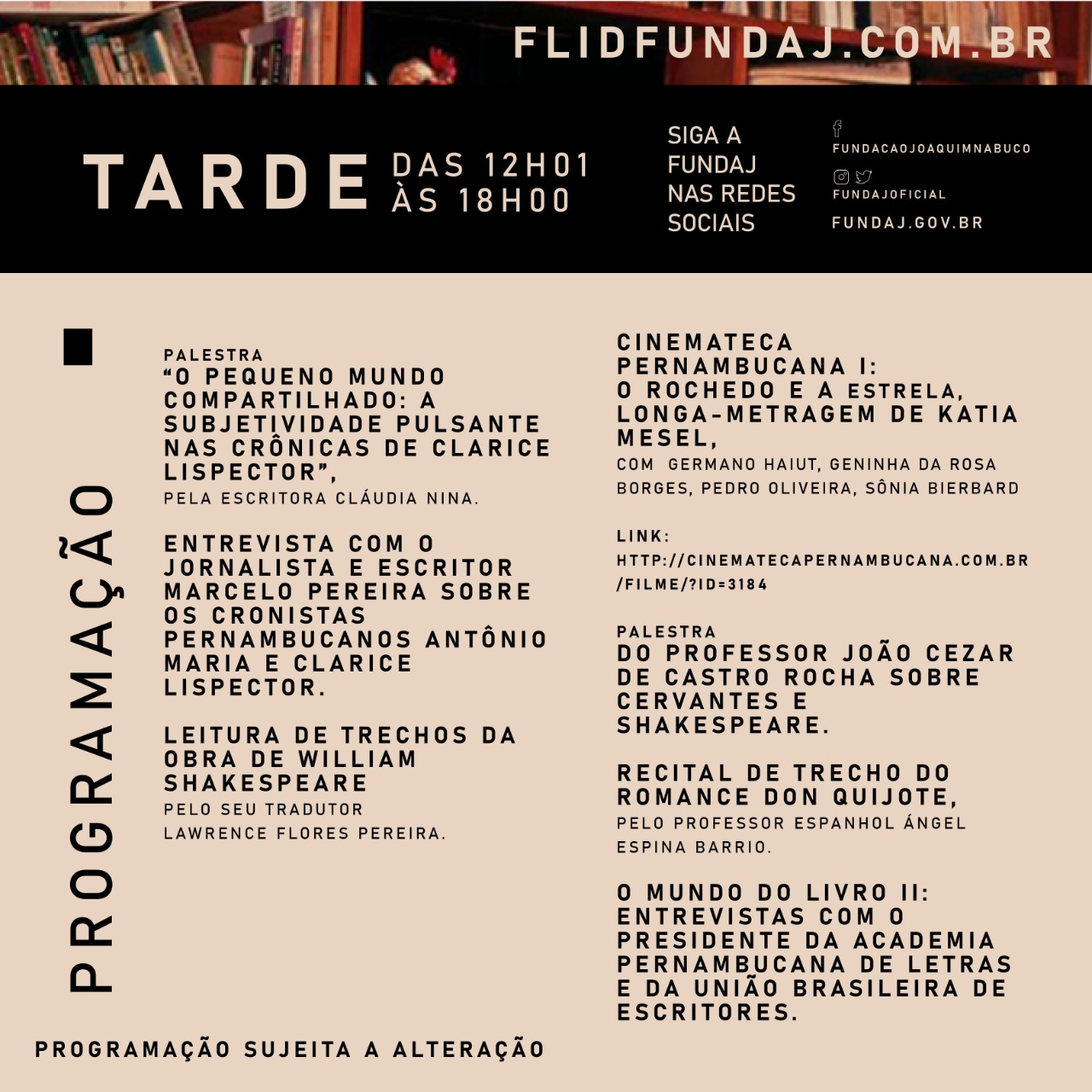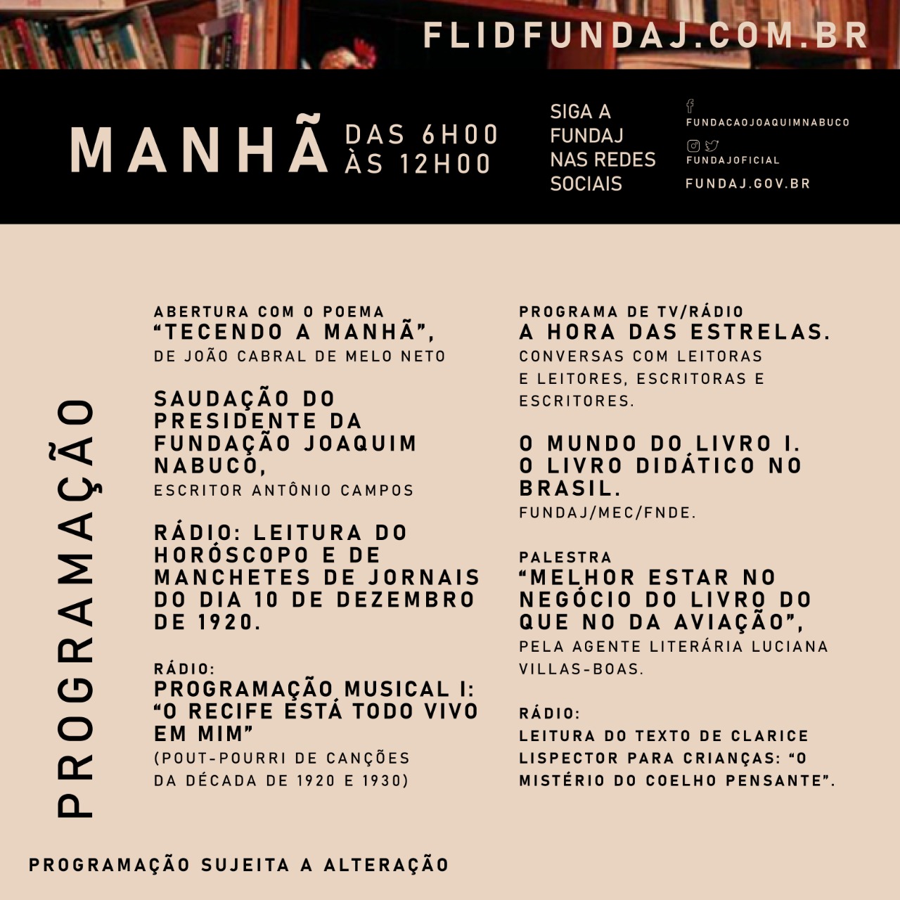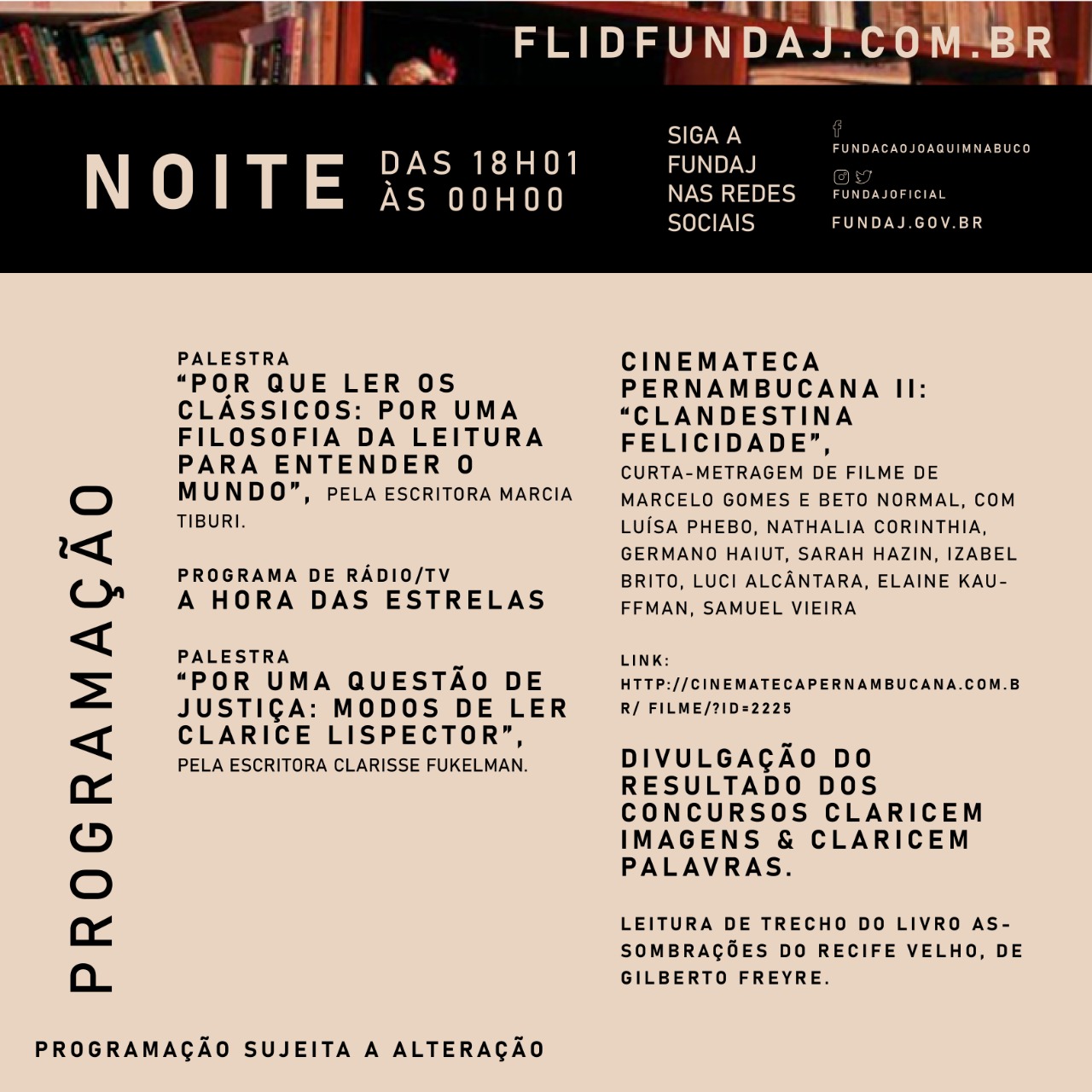 Com uma programação híbrida, as atividades contarão com transmissão simultânea no site flidfundaj.com.br e nas redes sociais da Fundaj - Instagram, Facebook, Twitter, YouTube. Na abertura, às 6h, contará com o poema “Tecendo a manhã”, do poeta pernambucano João Cabral de Melo Neto, amigo de Lispector, além da fala do presidente da Fundação, Antônio Campos, ao vivo na TV Fundaj. A leitura do horóscopo e das principais manchetes de jornais do 10 de dezembro de 1920 (nascimento da homenageada), a programação musical trazendo canções do Recife nas décadas de 1920 e 1930, antecedem a primeira entrada do programa de rádio e TV “A Hora das Estrelas”.