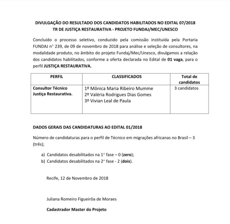 Página inicial > Imprensa > Divulgada a lista dos candidatos habilitados no edital 07/2018, de Justiça Restaurativa