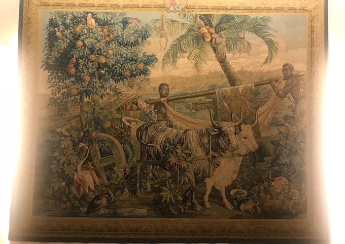 Réplica do tapete Gobelin da série Novas Índias, foi executada em 1735. O tapete traz no alto o brasão da família pernambucana Lima Cavalcanti de Araújo.