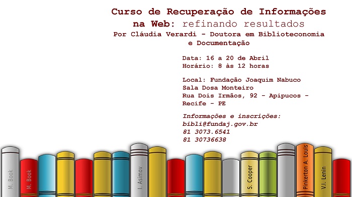 Com o objetivo de oferecer orientações básicas a respeito da informação disponível na internet, e como reconhecer sites de qualidade com rapidez e precisão, capacitando os pesquisadores a criar estratégias de busca de informação que facilitem o acesso ao conteúdo desejado, a Fundação Joaquim Nabuco, por meio da Biblioteca Blanche Knopf, oferece o curso "Recuperação de Informações na Web: refinando os resultados".