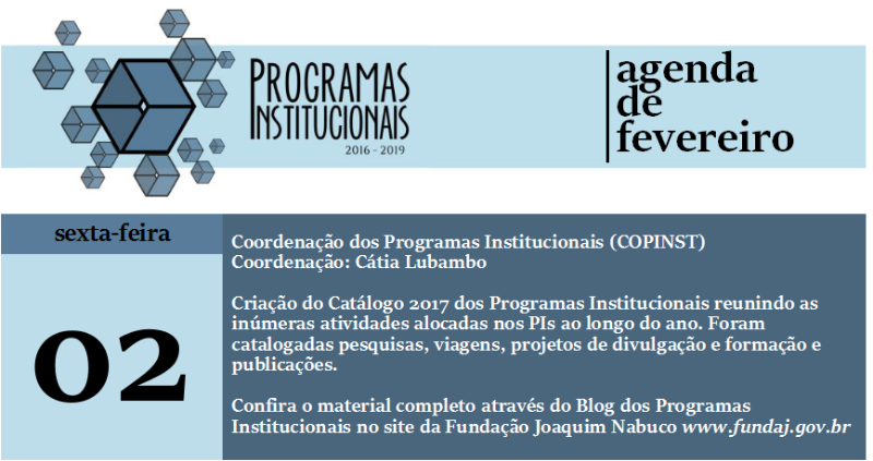 A intenção dos PI's é ampliar e consolidar uma rede de instituições atuantes e interessadas nos temas dos programas, de modo a potencializar os frutos e ganhos dos projetos e ações idealizadas e planejadas para o ciclo 2016-2019. A compilação de 2017 faz parte da agenda de fevereiro de 2018 dos Programas Institucionais da Fundaj.