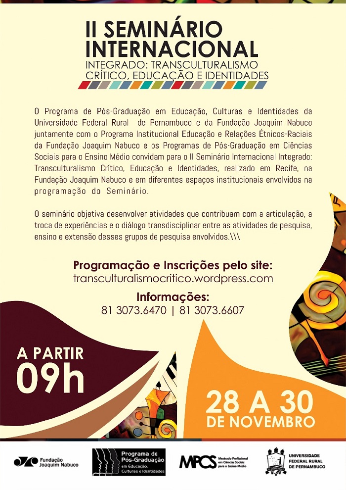 Veja a programação do evento AQUI. Veja, também, AQUI, a página do Mestrado em Educação, Cultura e Identidades, da Fundaj/UFRPE.