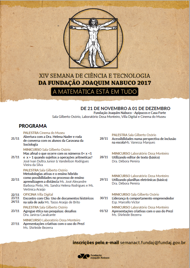 Divulgar as atividades realizadas dentro da Fundação Joaquim Nabuco e proporcionar aos estudantes do ensino médio da rede pública mais oportunidades de desenvolver as questões sociais são os principais objetivos da Semana de Ciência e Tecnologia promovida pela Fundaj. Realizado desde 2004, o encontro ocorre entre os dias 21 de novembro e 1º de dezembro.