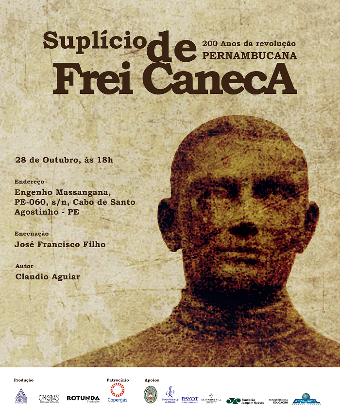 Como parte da comemoração dos 200 anos da Revolução Pernambucano de 1817, o Engenho Massangana vai receber, no dia 28 de outubro, a encenação do espetáculo "O Suplício de Frei Caneca", do diretor José Francisco Filho. Encenada pela primeira vez no anos 1970, a peça é um épico escrito por Cláudio Aguiar, que foca no período que vai do ordenamento até a condenação de Frei Caneca.
