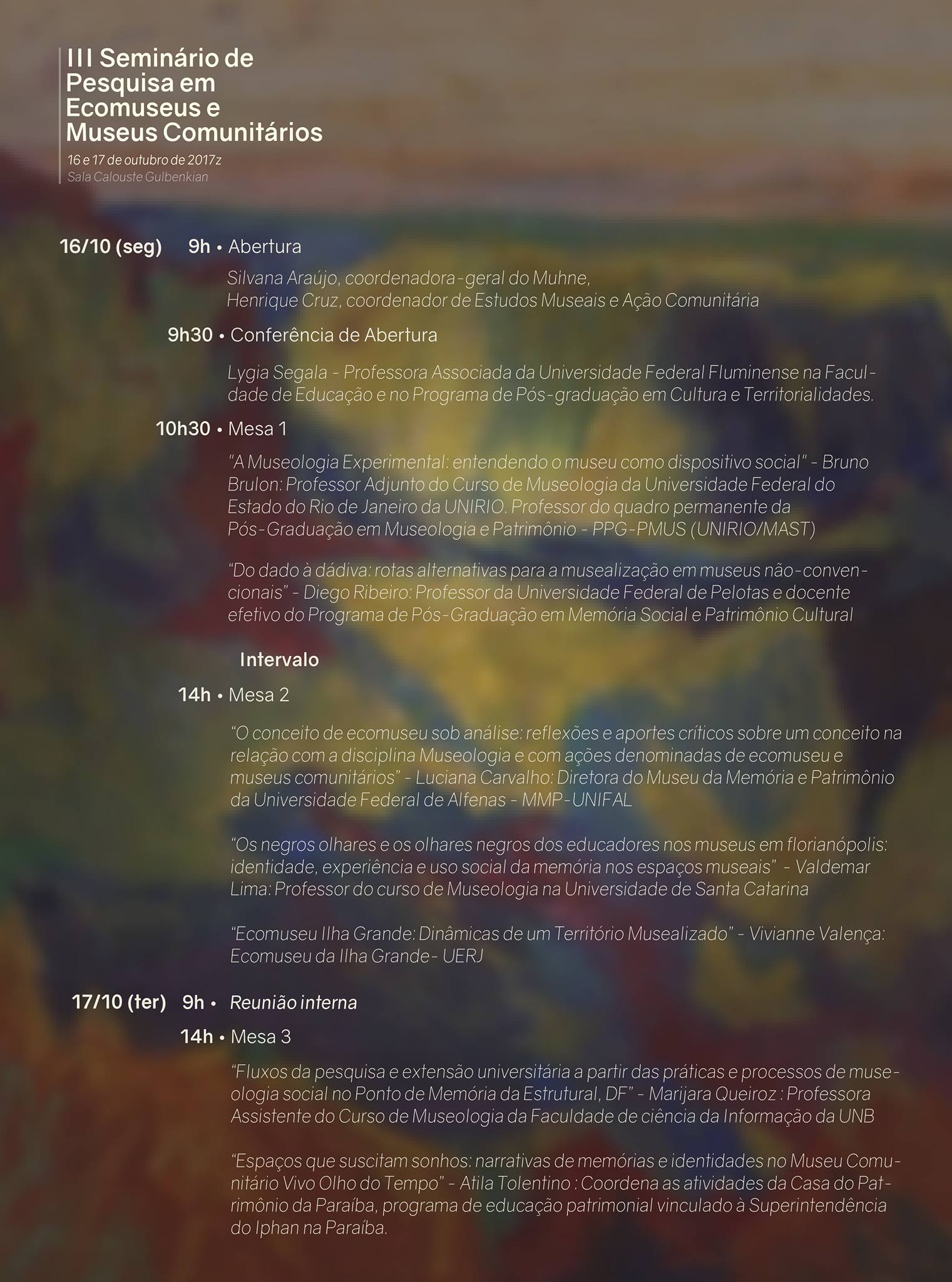 Nos dias 16 e 17 de outubro de 2017, o Museu do Homem do Nordeste realiza o terceiro encontro do Seminário de Pesquisa em Ecomuseus e Museus Comunitários.