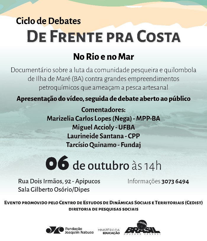 O Ciclo de Debate do dia 6/10 terá a apresentação do Vídeo No Rio e No Mar – documentário sobre a luta da comunidade pesqueira e quilombola de Ilha de Maré (BA) contra grandes empreendimentos petroquímicos que ameaçam a pesca artesanal. Após a apresentação do Vídeo teremos debate aberto ao público. Serão comentadores: Marizelia Carlos Lopes (Nega) – MPP – BA, Miguel Accioly –UFBA, Laurineide Santana – CPP e Tarcísio Quinamo – pesquisador da Fundaj
