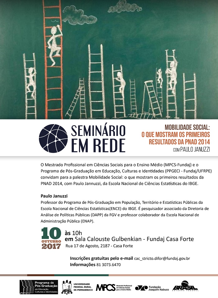 A Fundaj recebe no dia 10 de outubro, às 10h, na Sala Calouste Gulbenkian, em Casa Forte, mais uma edição do Seminário em Rede, dessa vez, com o tema "Mobilidade Social: O que mostram os primeiros resultados do PNAD 2014". A palestra será ministrada pelo professor do Programa de Pós-graduação em População, Território e Estatísticas Públicas da Escola Nacional de Ciências Estatísticas do IBGE, Paulo Januzzi.