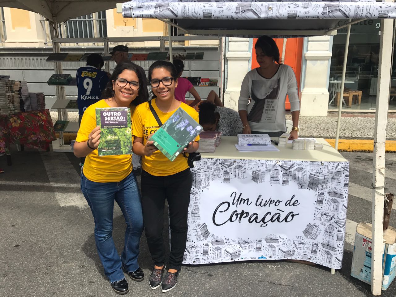 As gêmeas Laís Araújo e Laísa Araújo, 20 anos, estavam trabalhando no Recife Antigo quando viram o estande da campanha. Aproveitaram para dar uma pausa para conferir os exemplares expostos. “Além da doação, é importante promover a leitura”, disse Laís.