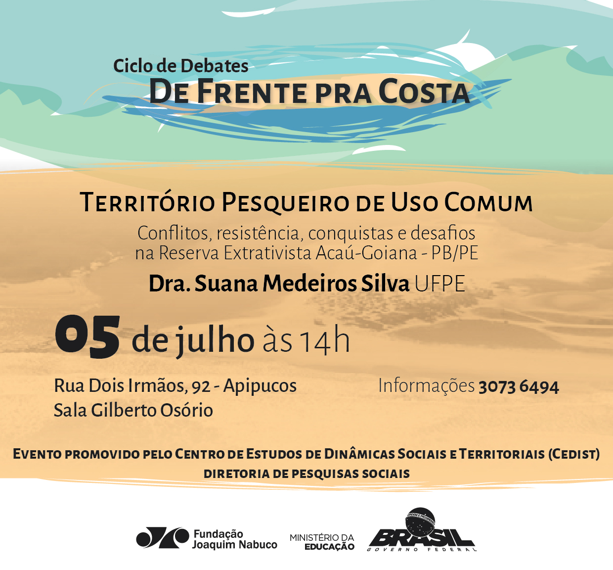 Com o intuito de discutir a gestão ambiental dos territorios pesqueiros da reserva extrativista Acaú-Goiana, o Centro de Estudo de Dinâmicas Sociais e Territoriais (Cedist) em parceria com a Fundação Joaquim Nabuco e a Diretoria de Pesquisas Sociais apresenta a 19ª edição do Ciclo de Debates de Frente pra Costa.