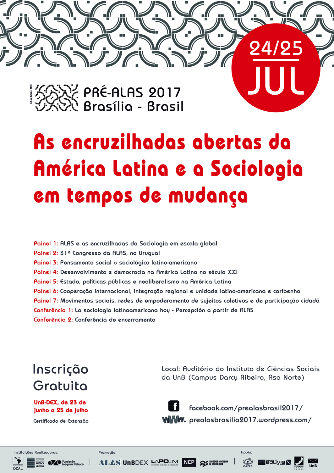 Nos dias 24 e 25 de julho de 2017, a Universidade de Brasília receberá o Pré-Alas Brasília 2017. Com o tema “As encruzilhadas abertas da América Latina e a Sociologia em tempos de mudança”, o evento tem como objetivo a oportunidade de interação, intercâmbio e cooperação entre sociólogos e cientistas sociais brasileiros e de outros países latino-americanos à luz de agendas de pesquisas e debates sobre temas e problemáticas na região.
