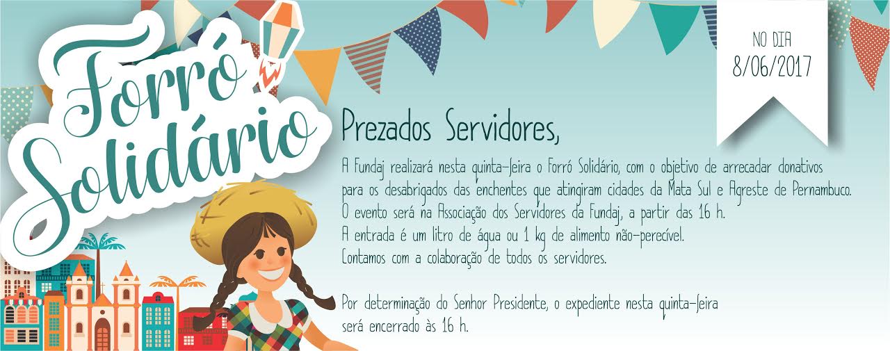 A Fundaj realizará nesta quinta-feira o Forró Solidário, com o objetivo de arrecadar donativos para os desabrigados das enchentes que atingiram cidades da Mata Sul e Agreste de Pernambuco. O evento será na Associação dos Servidores da Fundaj, a partir das 16 h. A entrada é um litro de água ou 1 kg de alimento não-perecível. Contamos com a colaboração de todos os servidores.