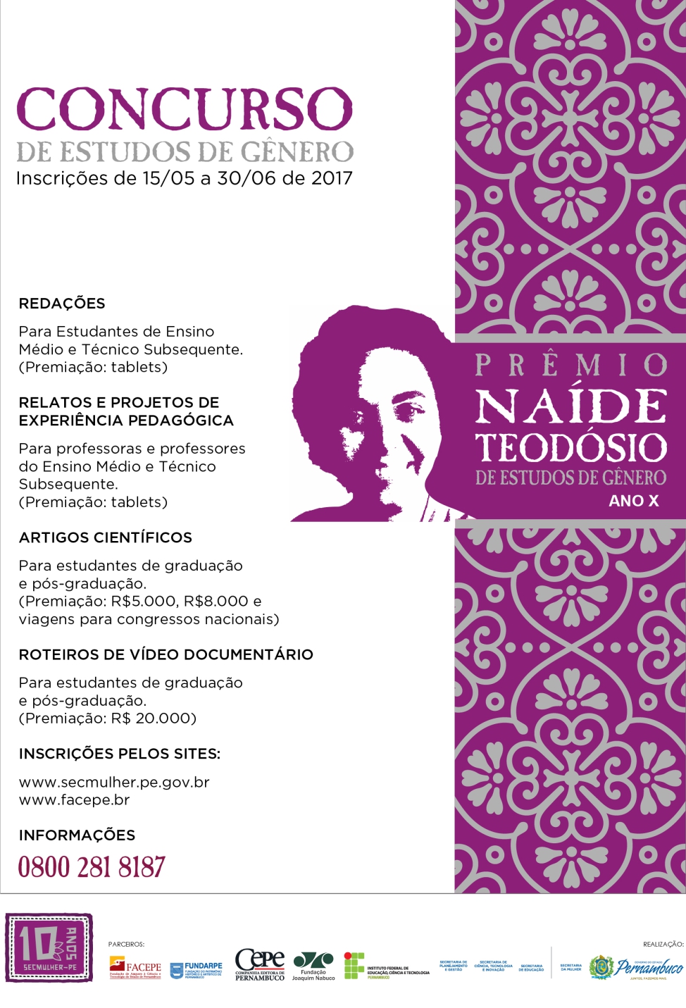 A Fundação de Amparo à Ciência e Tecnologia de Pernambuco (FACEPE), parceira da Fundação Joaquim Nabuco, lança a décima edição do Prêmio Naíde Teodósio de Estudos de Gênero. O período de inscrições vai até 30 de junho de 2017.