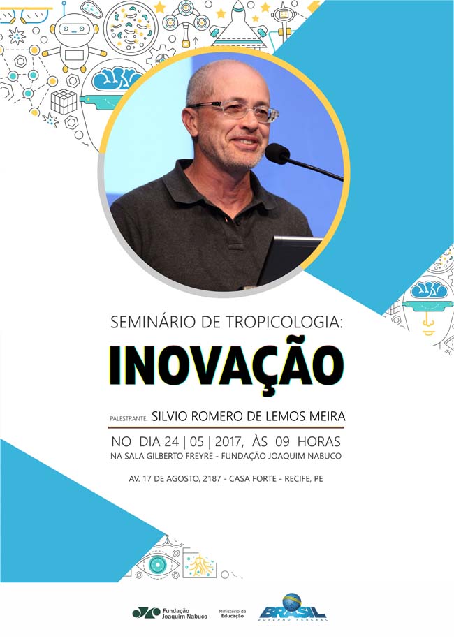 O Seminário de Tropicologia, de número 400º, irá acontecer no dia 24 de maio, às 9h, na sala Gilberto Freyre, na Fundação Joaquim Nabuco/Fundaj, de Casa Forte (Avenida 17 de Agosto, 2187). Dessa vez, o tema que será discutido pelo palestrante Silvio Meira, presidente do conselho do Porto Digital, é ‘”Inovação”.