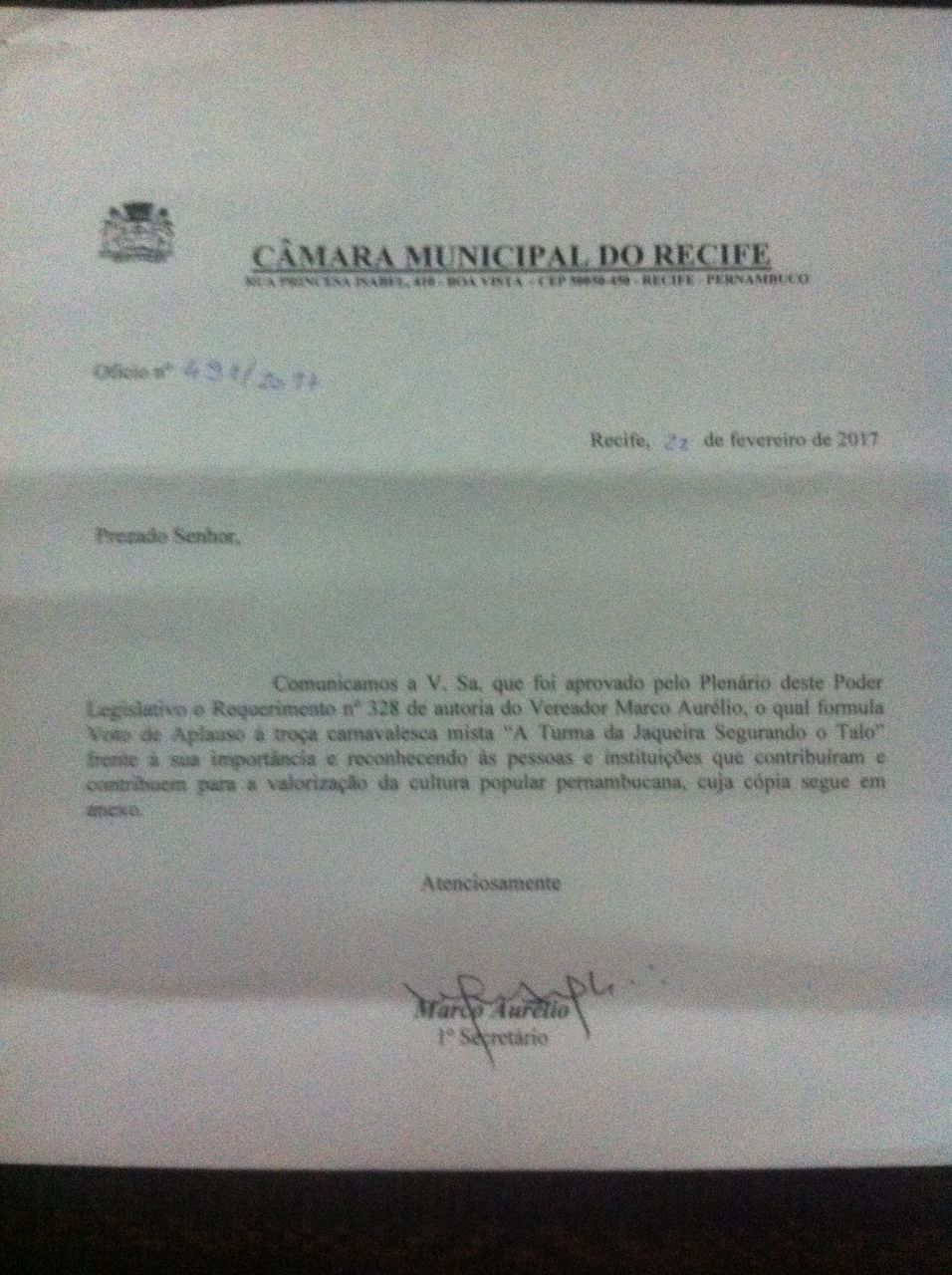 A troça dos servidores da Fundação Joaquim Nabuco (Fundaj), a "Turma da Jaqueira Segurando o Talo", recebeu um Voto de Aplauso da Câmara dos Vereadores da Cidade do Recife, no dia 22 de fevereiro de 2017, que foi proposto pelo vereador Marco Aurélio, que é o 1º Secretário da Câmara. Vejam a íntegra do documento Aqui.