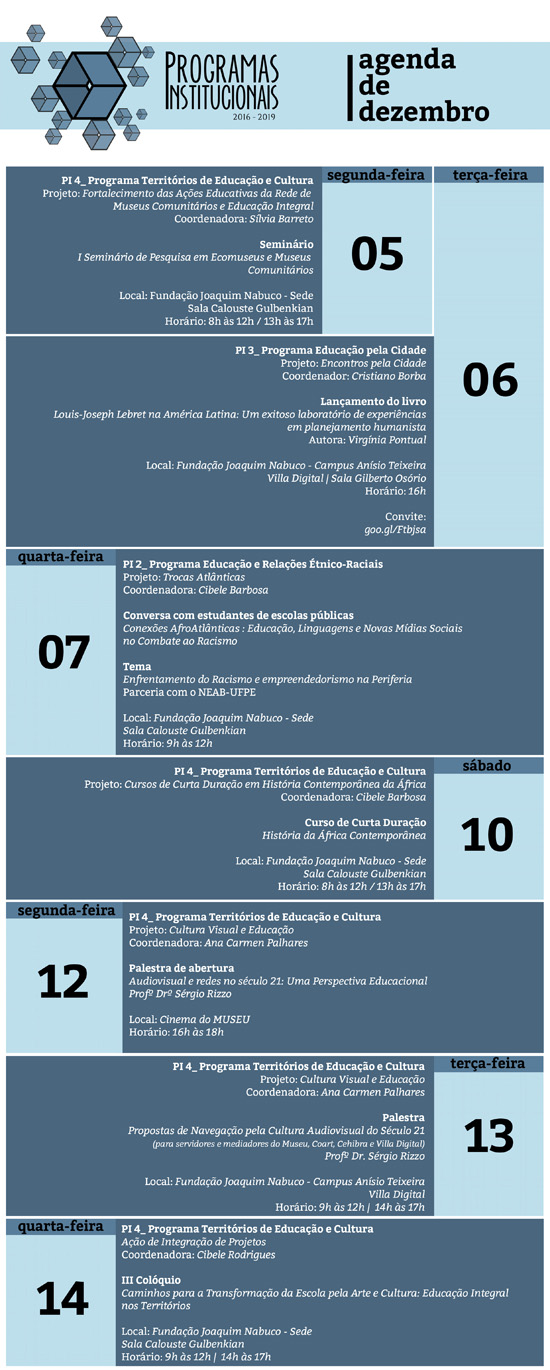 Página inicial > Imprensa > Agenda do mês de dezembro dos Programas Institucionais (2016-2019) da Fundaj