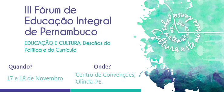 Sua presença no III Fórum de Educação Integral de Pernambuco será de extrema importância para fortalecer e ampliar ações e debates da pauta da Educação Integral, no âmbito da interface da educação com a cultura.