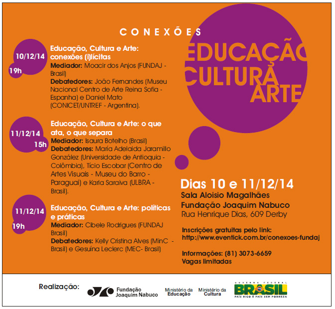 O MEC e o MinC serão representados, respectivamente, por Gesuína Leclerc e Kelly Alves, que debaterão as políticas públicas de interdependência entre Educação e Cultura e prática na implementação dessas políticas; com mediação dos pesquisadores da Fundaj Moacir dos Anjos, curador de Artes Visuais, e Cibele Rodrigues, da Coordenação Geral de Estudos Educacionais (CGEE), que desenvolve pesquisa de avaliação do projeto Mais Educação, do MEC.