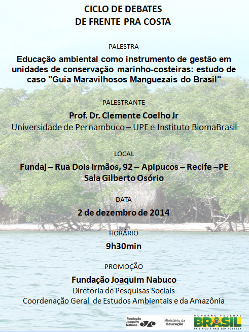 Com o objetivo de refletir sobre as várias temáticas ligadas às regiões costeiras e ribeirinhas, seja a partir de experiências empíricas, seja oriunda de reflexões teórico-metodológicas, temos o prazer de convidá-lo(a) para o terceiro encontro do Ciclo de Debates DE FRENTE PRA COSTA no ano de 2014, que abordará o tema Educação Ambiental como instrumento de gestão em Unidades de Conservação marinho-costeiras: estudo de caso "Guia Maravilhosos Manguezais do Brasil".