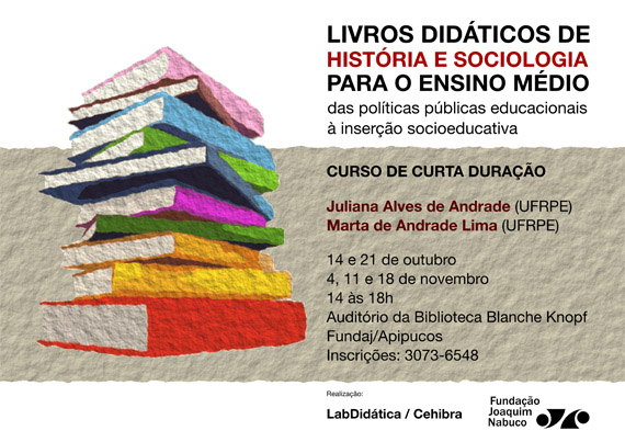O Laboratório Acervos e Material Didáticos (LabDidática/Meca) promove o curso de curta duração "Livros Didáticos de História e Sociologia para o Ensino Médio: das políticas públicas educacionais à inserção socioeducativa", ministrado pelas professoras Juliana Alves de Andrade e Marta Margarida de Andrade Lima, da Universidade Federal Rural de Pernambuco (UFRPE). As aulas ocorrerão nas tardes das terças-feiras, entre os dias 14 de outubro e 18 de novembro, no auditório da Biblioteca Blanche Knopf. As inscrições devem ser feitas pelo formulário disponibilizado no seguinte endereço: http://goo.gl/forms/WVxdeQJ2QY
