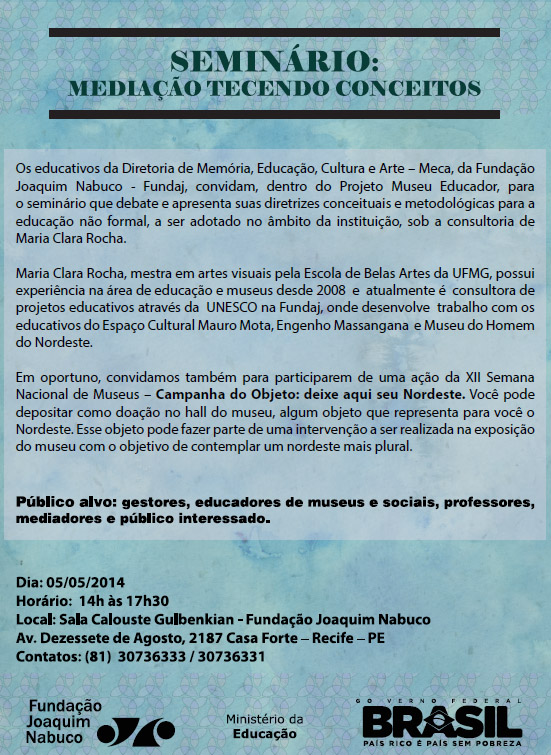 Página inicial > Imprensa > Museu do Homem do Nordeste promove Seminário "Mediação Tecendo Conceitos"