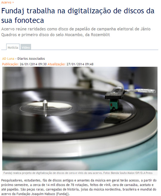 O Diario de Pernambuco publicou reportagem especial sobre o processo de digitalização do acervo fonográfico da Fundação Joaquim Nabuco. A reportagem foi veiculada na edição de domingo, 26 de janeiro de 2014.