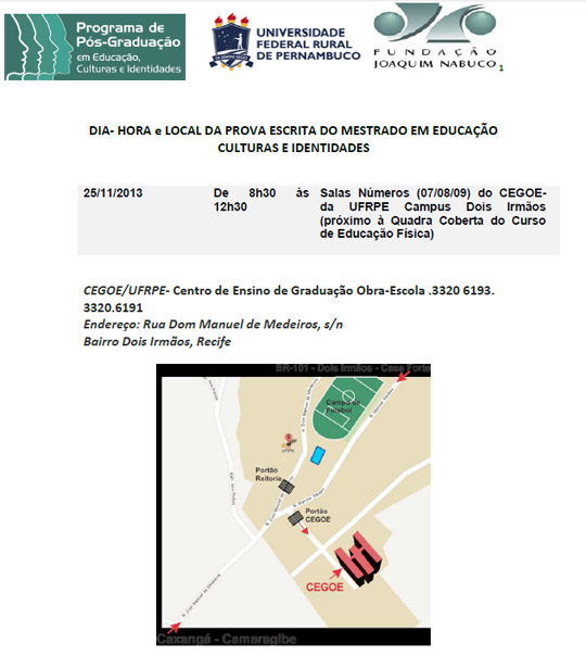 Saiu a relação das inscrições homologadas do Mestrado Acadêmico Asociado UFRPE e Fundaj "Educação, Culturas e Identidades" (PPGECI).