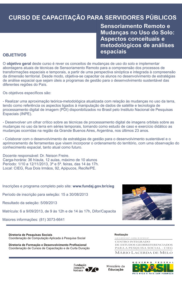 CURSO "SENSORIAMENTO REMOTO E MUDANÇAS NO USO DO SOLO", DE 01/10/2013 A 12/11/2013, 3ª E 5ª 14H ÁS 17H, NO CENTRO INTEGRADO DE ESTUDOS GEORREFERENCIADOS PARA A PESQUISA SOCIAL MÁRIO LACERDA DE MELO - CIEG, APIPUCOS - PE.