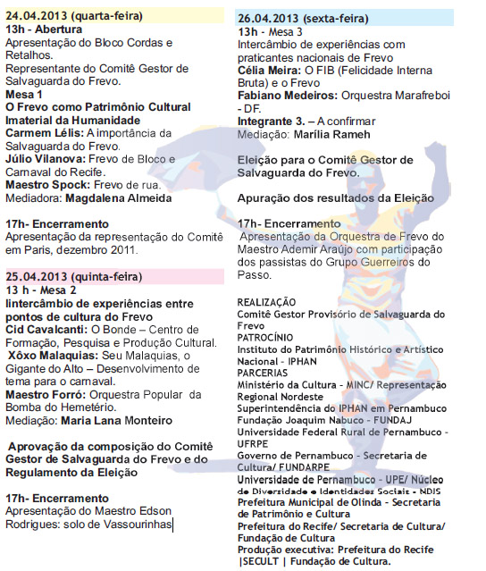A Fundação Joaquim Nabuco está representada pela pesquisadora e folclorista Rúbia Lóssio no 2º Encontro do Plano Integrado de Salvaguarda do Frevo, que está sendo realizado de 24 a 26 de abril, no Teatro Apolo, no Bairro do Recife Antigo.