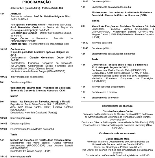 A Fundação Joaquim Nabuco, através de sua Diretoria de Pesquisas Sociais, promove, de 05 a 07 de dezembro, no Maranhão, o XIV Simpósio ObservaNordeste. Segue a programação: