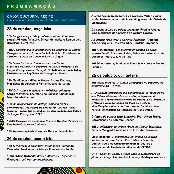 Palestras, lançamentos de livros, recitais, exibição de documentários e apresentações culturais compõem a extensa programação que prossegue até a sexta-feira (26/10), na capital pernambucana.