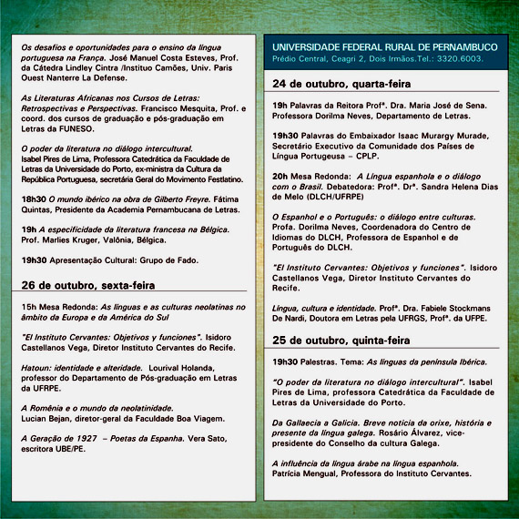 “Trago uma saudação da ministra Marta Suplicy, nesse momento em que Recife sedia esse importante evento voltado para a valorização das línguas neolatinas. O governo brasileiro tem criado mecanismos internacionais de estímulo à cultura. Gostaria de levar à ministra sugestões para que o MinC possa contribuir com a valorização e resgate da nossa língua e nossa literatura, com propostas objetivas para que esse movimento ganhe força e apoio através de políticas públicas”, disse Jeanine Pires, que foi agraciada com o diploma de Apoiadora da Neolatinidade, concedido pelo historiador, escritor e organizador do FestLatino, Humberto França. Na ocasião, o ex-ministro de Ciência e Tecnologia, Roberto Amaral, recebeu o diploma de Personalidade da Neolatinidade.