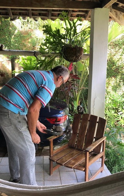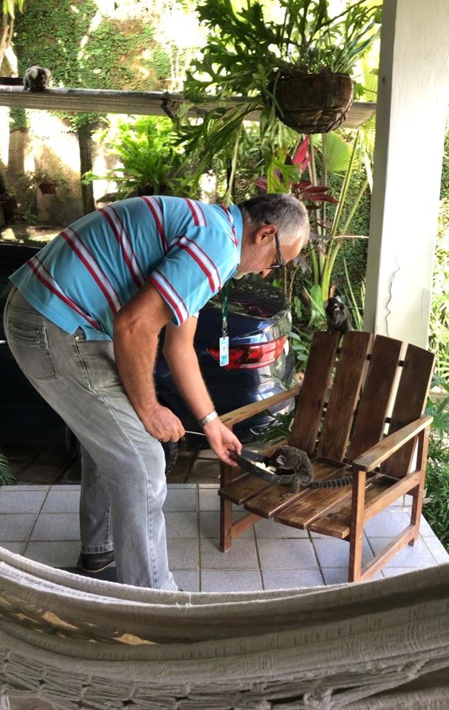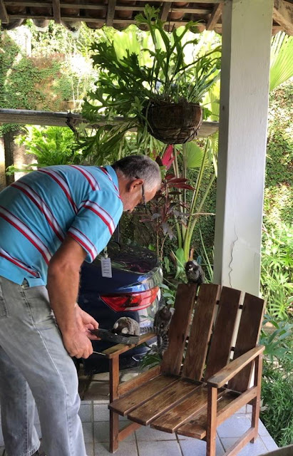 Já faz algum tempo que uma família de Saguis (Callithrix jacchus) frequenta a nossa residência. Começou com um casal, que prontamente Clarinha e Gabi (netas) colocaram os nomes de "Badu" e "Jeique", e desse casal já nasceu uma linda prole, atualmente com 6 espertos exemplares. Aqui em casa eles se sentem à vontade. Sem cerimônia alguma, vêm se alimentar em nossas mãos. Procuro sempre dar alimentos de boa qualidade e manter os recipientes higienizados, para garantia de uma vida saudável para todos. Eu, particularmente, me sinto um privilegiado pela presença deles entre nós. Moro numa cidade Grande (Recife), cercado por uma selva de pedras e tenho esse cenário maravilhoso, diariamente. E essa amizade com os animais vai longe! Creio que seja o Homem das Barbas no comando!
