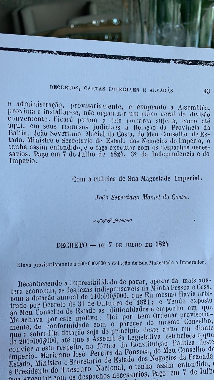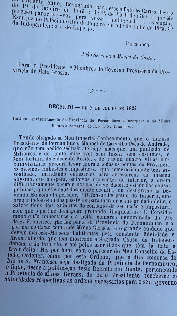 Decreto Imperial de 07 de Julho de 1824 desliga provisoriamente a comarca de do Rio São Francisco da província de Pernambuco
