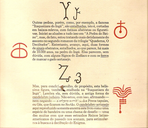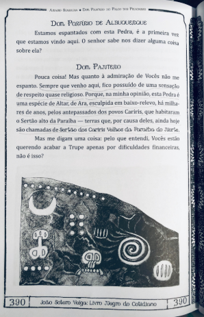 Ariano era um dos maiores admiradores daquelas inscrições e visitava o lugar com alguma frequência, segundo testemunham sua família e as pessoas que tomam conta do sítio arqueológico. Como se isso não bastasse, elegeu a pedra como uma espécie de ícone da cultura brasileira, com citações constantes, seja nas palestras que fazia Brasil afora, seja em sua própria obra - romances, peças de teatro e até no raríssimo Ferros do Cariri*** -, por meio de descrições, fotos, desenhos ou de imagens mescladas com textos que ele mesmo produzia e chamava de iluminogravuras.