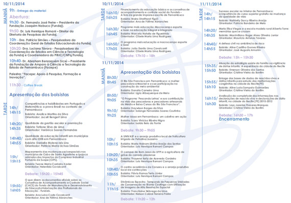 E para comemorar o 10° ano do evento, que está inserido nas atividades da Xl Semana Nacional de Ciência e Tecnologia, a programação ocorrerá da seguinte maneira: no dia 10 de novembro, pela manhã, haverá uma cerimônia de abertura que contará com a presença do Presidente da Fundação Joaquim Nabuco, Dr. Fernando José Freire, do Diretor da Diretoria de Pesquisas da Fundaj, Dr. Luis Henrique Romani, da Pesquisadora da Coordenação Geral de Estudos Educacionais da Fundaj, Dra. Patrícia Simões, da Pesquisadora da Coordenação de Estudos em Ciência e Tecnologia da Fundaj e Coordenadora do PIBIC/CNPq/Fundaj, Dra. Luciana Távora.