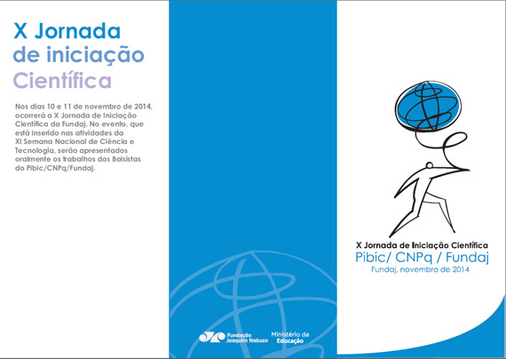 Nos dias 10 e 11 de novembro de 2014, em horário integral, ocorrerá a X Jornada de Iniciação Científica (JOIC) da Fundação Joaquim Nabuco (Fundaj), na sala Gilberto Osório, no bairro de Apipucos (Rua Dois irmãos, 92).