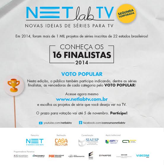 A empresa de serviços convergentes via cabo da América Latina NET e a Casa Redonda Cultural divulgam os finalistas do Concurso NETLABTV2014, projeto que premia ideias e formatos de séries brasileiras com foco em TV por assinatura nas categorias de ficção e não-ficção. Ao total, foram mais de mil inscritos de 22 estados brasileiros.
