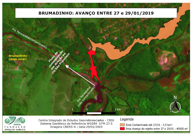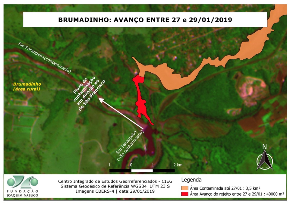 Logo após o desastre tecnoindustrial do rompimento da Barragem de Rejeitos de Mineração do Córrego do Feijão na área rural de Brumadinho-MG ocorrida em 25/01/2019, a Fundação Joaquim Nabuco (Fundaj), por meio do seu Centro Integrado de Estudo Georreferennciados (CIEG) da Diretoria de Pesquisas Sociais (Dipes) reuniu esforços de pesquisa em caráter emergencial no sentido de mapear o deslocamento da pluma de contaminação do solo e da água em Brumadinho, no rio Paraopeba e na Represa de Três Marias e os possíveis impactos e desdobramentos para o rio São Francisco.