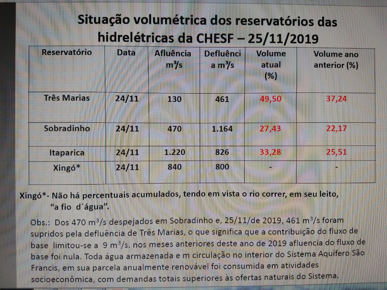 Vazões defluentes médias mínimas diárias de Sobradinho inferiores a 1300 m³/s (1.281 m3/s mais a vazão incremental do trecho entre Sobradinho e a foz do São Francisco ocasionam problemas na navegação (trecho Sobradinho / Juazeiro), em diversas captações de industrias, bem como em tomadas d´água para abastecimento de cidades e projetos agrícolas localizados no trecho Sobradinho / Itaparica. Já foram liberadas vazões médias diárias inferiores a este valor, excepcionalmente, por conta do racionamento de energia (1987 e 2001), tendo sido necessária em 2001, a Resolução da Presidência da República Nº 39 de 21/08/2001 autorizando a adoção de vazões abaixo da média mínima diária citada. Os demais usuários do rio foram devidamente alertados quando da realização das referidas programações de vazões médias mínimas diárias, assim como foi necessária a execução de obras provisórias para viabilizá-las. Fonte: Ramina, H. R, “Concepção de uma estratégia robusta para a Gestão dos Usos Múltiplos das Águas na Bacia Hidrográfica do rio São Francisco” (Volumes I, II e III). As vazão defluente na foz do rio São Francisco inferior a 1300 m3/s (ela se tornou menor muito antes da seca que começou em 2.012, conforme dados do posto de Traipu;) provoca a interiorização da interface água doce do rio/água salgada do mar tornando as água do rio impróprias para consumo humano. É o que ocorre desde então, afetando o abastecimento das comunidades ribeirinha e das cidades situadas no baixo curso do rio como Penedo e até Aracaju que capta água neste trecho do baixo curso do rio. Conforme foi visto esta vazão corresponde ao fluxo de base suprida, principalmente, pelos aquíferos do sistema São Francisco.