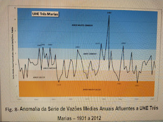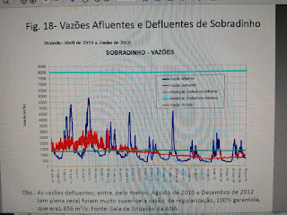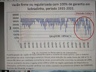- •Uma segunda informação vem corroborar as assertivas acima colocadas. É que, segundo a ASCOM – Assessoria de Comunicação do CBHSF, existem 1.423 captações no aquífero Urucuia, entre poços e nascentes cadastradas. Estimando-se que, na realidade, elas sejam cerca de 3.000. Ainda revela a ASCOM que no aquífero Bambuí, o número de poços ascende aos 21.430 perfurados. Um exagero! O desmatamento da superfície dos tabuleiros também contribuiu, sobremaneira, para reduzir as taxas de infiltração e, consequentemente, de circulação e descarga, com a impermeabilização do solo pela sua consolidação, favorecida pelas perdas de água por evaporação. Esta perda faz com que haja concentração de sais e de óxidos, que se comportam como cimentos. Alojados entre os grãos dos sedimentos que formam o solo, a petrificação diminui a porosidade original das rochas granulares como as areias, transformadas em arenitos. Finalmente, contribuiu para o consumo de quase todo o volume útil de Sobradinho o fato de que, por cerca de 40 dias do ano de 2013, o ONS, com a anuência de a ANA ter liberado uma vazão acima da capacidade de regularização de Sobradinho, atingindo picos de 3.000 m3/s, com o objetivo de injetar energia na rede de distribuição interligada, visando suprir a deficiência dessa demanda da região Sudeste do Brasil Ver figura 18, a seguir: