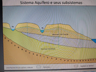 - • As Figs. 2 e 3, a seguir, procuram traduzir, de uma forma simplificada, as relações intra-sistema de seus subsistemas aquíferos, assim como as suas conexões com os sistemas meteorológico, hidrográfico e oceanográfico. No caso, por hipótese, admite-se que o subsistema sob pressão é do tipo semiconfinado, com carga piezométrica superior à carga hidráulica do subsistema livre.