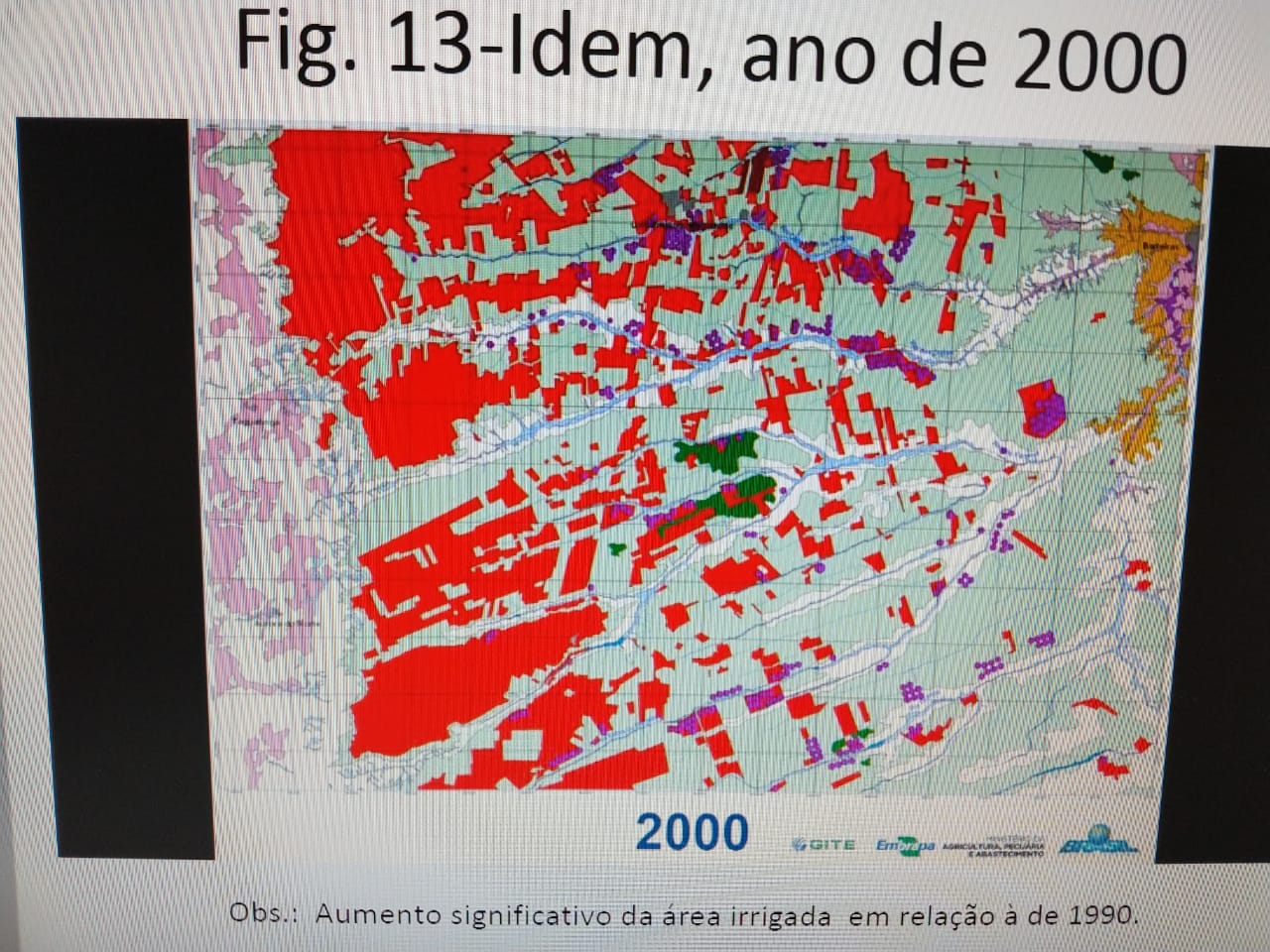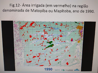 - •Conforme se pode verificar, o mapa de Mapitoba mostra, em vermelho. os solos irrigados nesta região, os quais s encaixam na sequência de rochas sedimentares constituintes do Grupo Urucuia que forma uma superfície plana, onde não há barragens superficiais. Toda água usada na irrigação destas áreas é proveniente do bombeamento de poços profundos nelas perfurados.