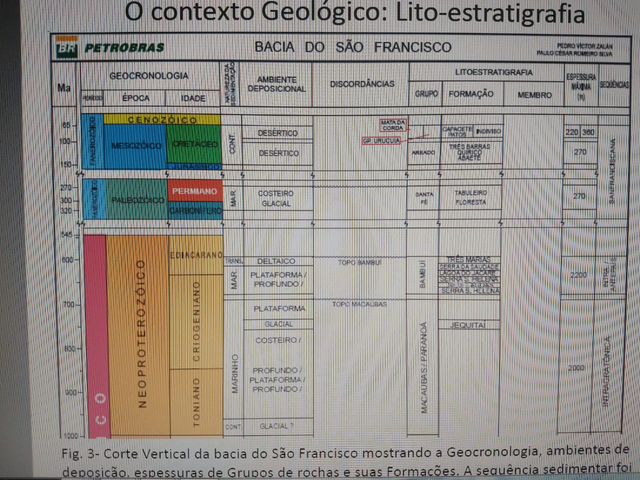 - •A bacia sedimentar do São Francisco ocupa uma área de 350.000 km2. A bacia é preenchida, predominantemente, por rochas sedimentares Proterozóicas que constituem o Supergrupo Espinhaço e os Grupos Araí, Paranoá, Macaúbas e Bambuí, este o grupo mais superior, aflorando com suas Formações na superfície da bacia hidrográfica do Rio São Francisco. Ainda ocorrem rochas sedimentares Permocarboníferas (Grupo Santa Fé), Eocretássicas (Grupo Areado) seguindo-se (no Neo-Cretáceo) por deposição de rochas vulcânicas (Grupo Mata da Corda) sobre as quais foram depositados os arenitos do Grupo Urucuia. Estes três últimos grupos de rocha , de idades Cretássicas e natureza continental, predominante depositados em ambiente desértico, formam as chapadas e os tabuleiros da bacia sedimentar São Francisco, sendo que o Grupo Urucuia ocupa a maior área desta bacia, formando uma chapada contínua que se estende desde o norte de Minas Gerais passando pela Bahia e pelas fronteiras dos Estados do Tocantins, Maranhão e do Piauí, formando a região hoje conhecida como Matopiba ou Mapitoba.