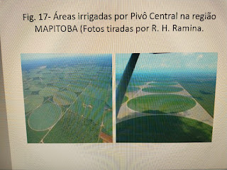 - •Um deles está contido no relatório de autoria do técnico, consultor em recursos hídricos, Rodolpho H. Ramina, elaborado para a AGB Peixe Vivo, em Dezembro de 2014, e divulgado, informalmente, no site da ABRH-Gestão, do qual se transcreve o texto seguinte: “Voei no Oeste da Bahia, nos grandes chapadões do cerrado baiano, a leste de Tocantins e do Jalapão. Sobre o Aquífero Urucuia, a caixa d’água do rio São Francisco e responsável por manter perene durante as secas, mesmo atravessando o Semiárido. Lá em cima dos chapadões, pivôs de irrigação. Medimos. Com um diâmetro em torno de 1.250 m, eles chegam a ter 125 hectares cada. Há centenas deles. Talvez mais de mil. As imagens de satélite de 2012 mostram uns 320 mil hectares com eles em todo o oeste baiano. Pivôs de irrigação usam muita água. Algumas vezes vemos as veredas transformadas em reservatórios. Na maior parte das vezes não vemos nada, a água vem do subsolo.” O relato é ilustrado por fotografias aéreas como a que mostra as inúmeras áreas de irrigação, objeto da Fig. 17, a seguir: