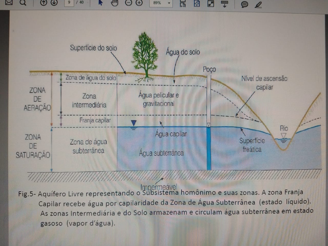 - •As reservas intersticiais: renováveis e permanentes compõem o subsistema livre; as renováveis participam do ciclo hidrológico, sendo recarregada, parcial ou totalmente, por infiltração das águas pluviais precipitadas sobre a superfície aflorante do subsistema que são armazenadas e circulam no interior do subsistema aquífero e saem na calha de rios na quantidade permitida pela sua porosidade eficaz;