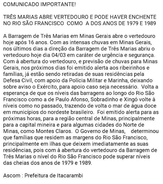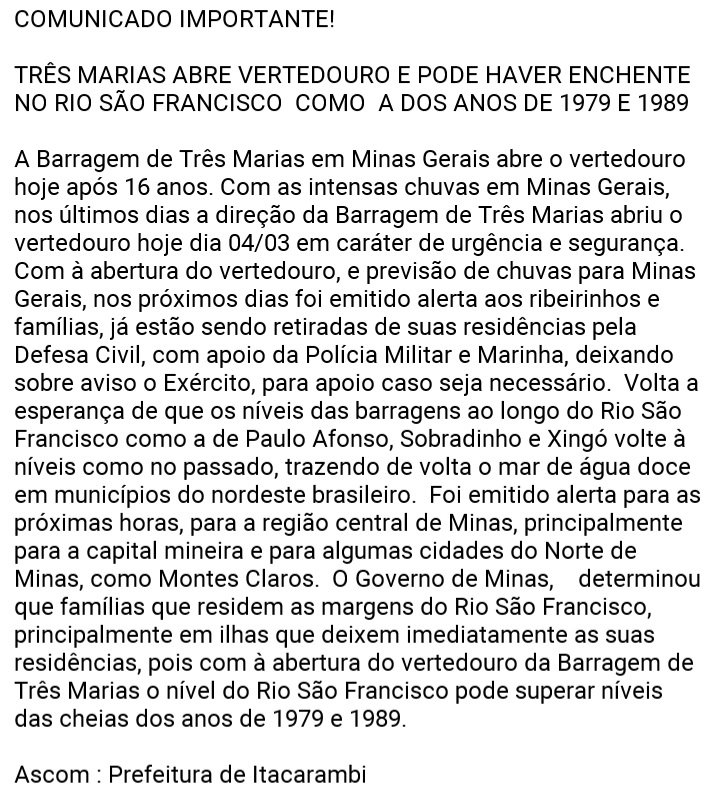 Informamos que a partir das 13h o vertimento será elevado para 1400m/s elevando por consequência a defluência no rio. Conforme instrução de operação, neste momento estão sendo realizados os comunicados aos moradores ribeirinhos, comunidades e órgãos responsáveis. Favor reforçarem este comunicado.