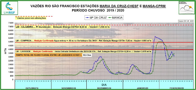 Dia 07/02: UHE Três Marias (controle das defluências de Três Marias) 300 m³/s; São Romão 1.878 m³/s; São Francisco – 2.558 m³/s; Bom Jesus da Lapa – 4.608 m³/s; Morpará – 4.376 m³/s; Juazeiro (controle das defluências de Sobradinho) 1.193 m³/s e Propriá (controle das defluências de Xingó) 1.219 m³/s. (dados da Chesf)