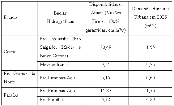 É uma verdade parcial. Na realidade, os sistemas de abastecimento destas cidades entram em colapso por uma ou pelo conjunto das razões seguintes: falta de capacidade de regularização pluri-anual, 100% garantida, dos reservatórios utilizados como fonte de abastecimento; falta de gerenciamento destes reservatórios, usando-os além de suas capacidades de regularização 100% garantida ou, ainda, obsolescência do sistema de abastecimento. Nunca, porém, por falta de água nas respectivas bacias hidrográficas locais. É o que demonstram as respostas das Secretarias Estaduais de Recursos Hídricos, respostas estas contidas no Ofício No 373/MI, datado de 16/09/2005, do Ministério da Integração Nacional dirigido à ANA, no qual estas Secretarias informam as vazões 100% garantidas de reservatórios localizados nas bacias receptoras que poderiam suprir as demandas estimadas para o Ano de 2025, com a segurança requerida, os 12 milhões de habitantes urbanos de cidades inseridas na região semi-árida, inclusive, Fortaleza/Ceará e Campina Grande, na Paraíba. O quadro abaixo sintetiza as informações, contidas no referido Ofício.